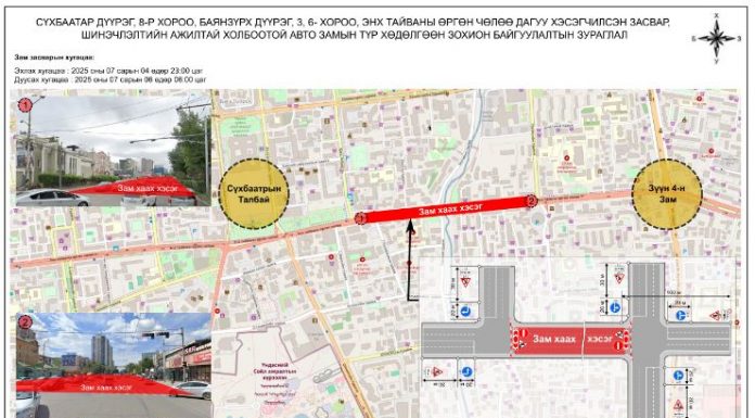 Энхтайваны өргөн чөлөөний хэсэгчилсэн засвар, шинэчлэлтийн ажлын хүрээнд Багшийн дээдийн уулзвараас Бөхийн өргөө хүртэлх авто замыг хааж шинэчилнэ.