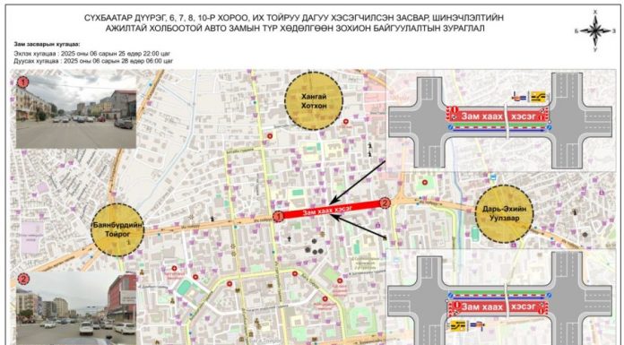 Нийслэлийн Сүхбаатар дүүргийн Их тойруугийн авто замыг хэсэгчлэн засах хүрээнд Өлзий төвөөс 100 айлын уулзвар хүртэлх авто замыг хааж шинэчилнэ.