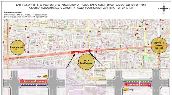 10 дугаар хорооллын уулзвараас 25 дугаар эмийн сангийн уулзвар хүртэлх замыг хааж, шинэчилнэ