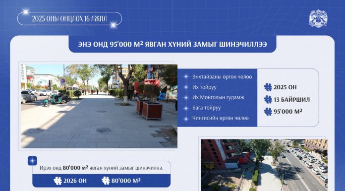 Энэ онд Улаанбаатар хотын гол гудамж, замууд болох Энхтайваны өргөн чөлөө, Их тойруу, Бага тойруу, Их Монголын гудамж болон Чингисийн өргөн чөлөө дагуух 13 байршилд 95 мянган ам.метр явган хүний замыг шинэчиллээ. Явган хүний замыг барзгар гадаргуутай байгалийн чулуун хавтангаар шинэчилж буй онцлогтой. 2026 онд үргэлжлүүлэн 80 мянган ам.метр явган хүний замыг шинэчилнэ.