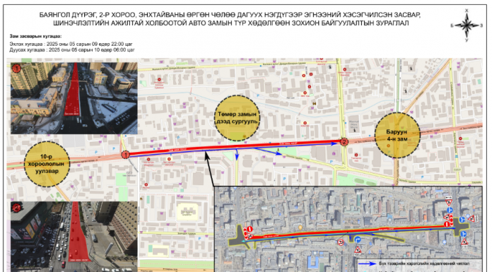 БГД-ийн 2 дугаар хороо, Энхтайваны өргөн чөлөөний авто зам шинэчлэлтийн ажлын хүрээнд 25 дугаар эмийн сангийн уулзвараас "Гранд плаза"-ийн уулзвар хүртэлх авто замын хойд хэсгийг 5 дугаар сарын 9-ний 22:00 цагаас 10-ны өдрийн 06:00 цагийн хооронд хааж, шинэчилнэ.