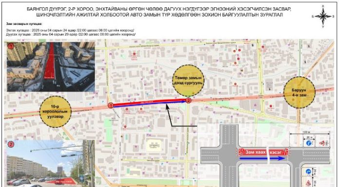 25 дугаар эмийн сангийн уулзвараас Төмөр замын дээд сургуулийн уулзвар хүртэлх авто замыг шөнийн цагаар хааж, шинэчилнэ