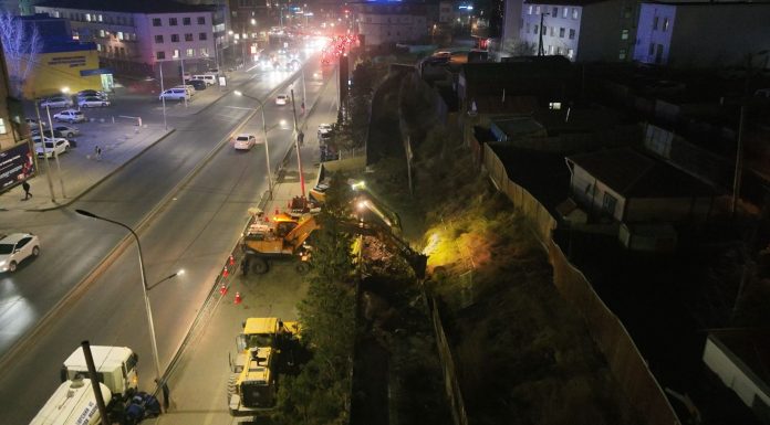 “Бөмбөгөр” худалдааны төвийн баруун талын үерийн далангийн түшиц ханыг шөнийн цагаар засварлаж байна