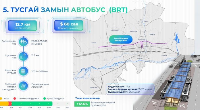 Нийслэлийг хөгжүүлэх 24 мега төслийн хүрээнд тусгай замын автобусны төслийг хэрэгжүүлнэ. Энэ хүрээнд төслийн зөвлөлдөх уулзалтыг өнөөдөр зохион байгууллаа. Уулзалтаар төслийн үйл ажиллагааны төлөвлөгөө, санхүүжилт болон зохицуулалтын дэд бүтцийн асуудлыг нарийвчлан хэлэлцэж, оролцогч талуудын уялдаа холбоог сайжруулах талаар хэлэлцлээ.  Тусгай замын автобусны /BRT/ төслийн захирал Т.Чинбатаас төслийн талаар тодрууллаа. Тэрбээр “Улаанбаатар хотын авто замын ачааллыг бууруулах энэхүү...