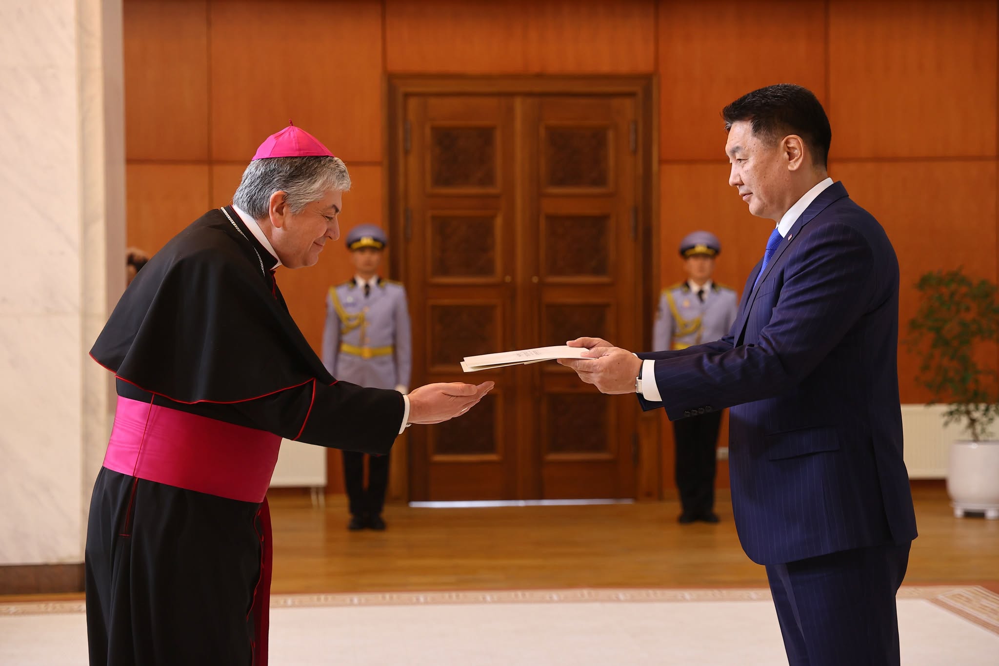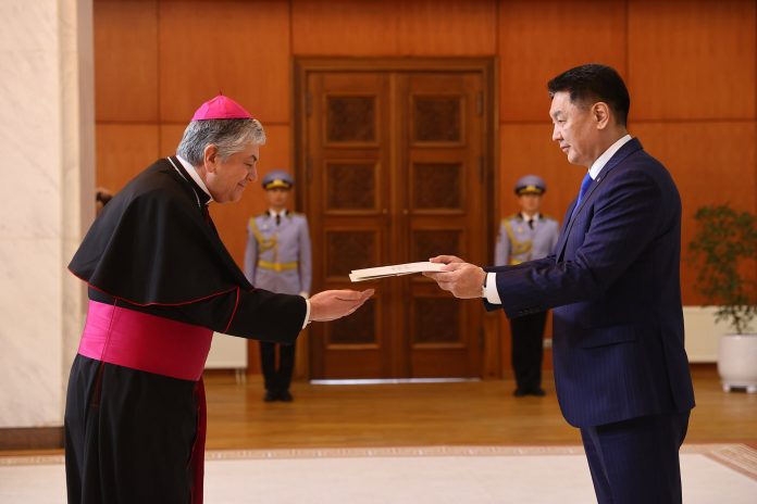 Ерөнхийлөгч Ухнаагийн Хүрэлсүхэд Гэгээн Ширээт Улсаас Монгол Улсыг хавсран суух Онц бөгөөд Бүрэн эрхт Элчин сайд Жованни Гаспари Итгэмжлэх жуух бичгээ өргөн барив.