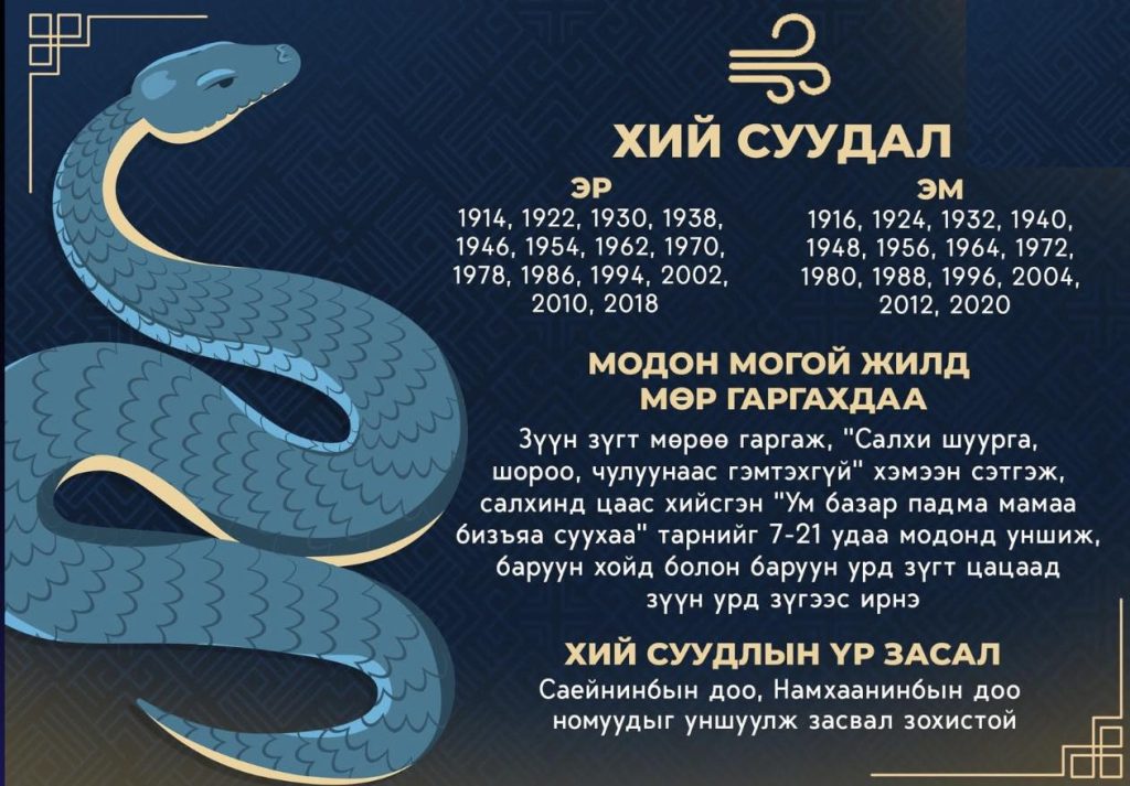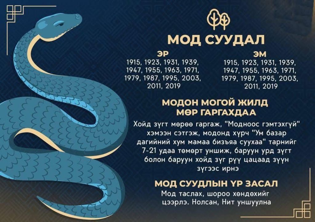 Мод суудлын цээр: Энэ жилдээ мод огтлох, хутга мэсээр оролдох, хөх өнгийн эд авах, ирвэсний арьс авах, хэл ам, маргаан хийх, гөрөөсний мах идэхээс зайлсхийж яв. Бөс, илжиг, бух, ирвэс, барын арьс бүү ав. Элэг, цөс, гэдэс, яр түүхий, хөлний өвчнөөс сэрэмжил. Мод гөлөглөх, шарлах үеэр болгоомжил. Бич сард баруунаа барцадтай. Нохой сарын 22-нд баруун бар баруун хойд зүгт бүү яв.