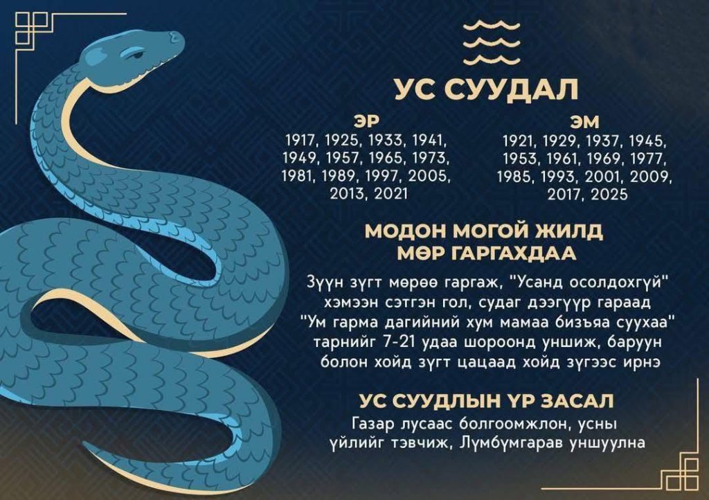 Ус суудлын цээр: Шар, хар өнгийн эд авах, гахай, загас, усанд үхсэн малын махыг тэвч. Ураг барилдахыг цээрлэ. Ус үерлэхэд анхаар. Бөөр, сав, гэдэс, үе мөч өвдөхөөс сэргийл. Лус савдаг, усны аюулд өртөж магад. Морь сар барцадтай, хонь сард баруун урагш муу. Тахиа сарын 15-ны өдөр үдийн хойно өмнө ба зүүн зүгт бүү яв.