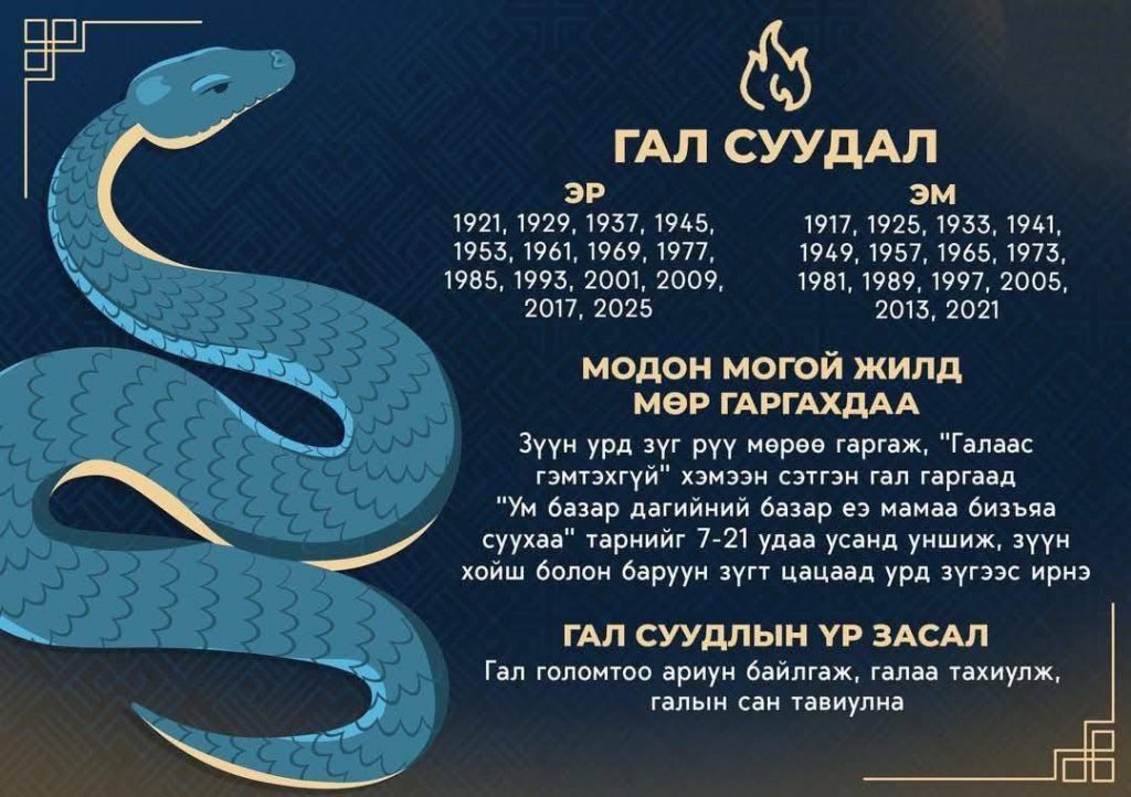 Гал суудлын цээр: Энэ жил улаан өнгийн эд, мал, арьс үс авахыг цээрлэнэ. Унаа мал унах, төмрийн аюулаас болгоомжил. Улаан идээ бүү гарга. Өвс шарлах үед, намрын адаг сард анхаар. Нохой сарын 20-ны өдөр баруун зүгт бүү оч. Од харшилна. Толгой, цээжин бие өвдөхөөс болгоомжил