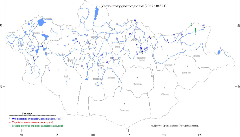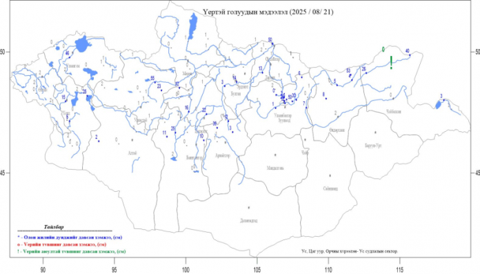 Хөвсгөлийн уулсаас усжих Үүр, Хэнтий нурууны баруун хажуугийн Хараа, Ерөө, Туул, Тэрэлж, Шарын гол, Сэлбэ, Улиастай, Хангай нуруунаас эхтэй Хөгшин Орхон, Богд, Таац, Заг голын усны түвшин өчигдөрийнхөөс 5-30 см нэмэгдэж, Тэрэлж, Сэлбэ, Туул гол Босгын гүүр орчимд олон жилийн дундаж түвшинг 25-30 см давлаа. Мөн Улз гол үерийн аюултай түвшинд хүрсэн хэвээр байгаа аж.