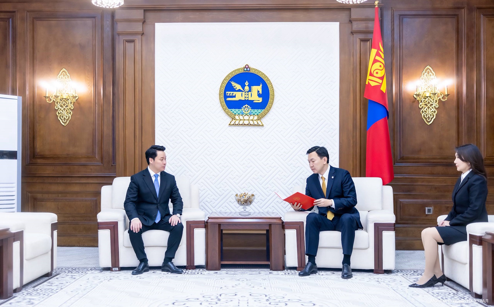Монгол Улсын Их Хурлын дарга Н.Учралд (2025.12.15) Элчин сайд нарыг эгүүлэн татах, томилох талаарх Монгол Улсын Ерөнхийлөгчийн зөвшилцөх саналыг Ерөнхийлөгчийн Тамгын газрын дарга А.Үйлстөгөлдөр өргөн мэдүүллээ.