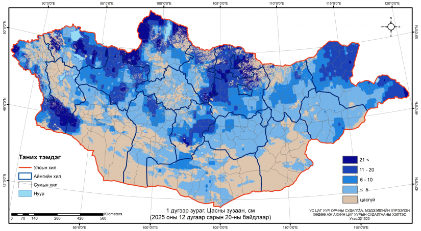 Үүнээс Увсын Ховд, Бөхмөрөн, Цагаанхайрхан, Малчин, Ховдын Алтай, Үенч, Хөвсгөлийн Цагааннуур, Улаан-Уул, Цагаан-Үүр, Цэцэрлэг, Өвөрхангайн Гучин-Ус, Булганы Рашаант, Дашинчилэн, Баяннуур, Сэлэнгийн Ерөө, Түшиг, Орхонтуул, Хүдэр, Мандал, Дархан-Уулын Шарын гол, Хонгор, Төвийн Эрдэнэд цасны зузаан 20 см-ээс дээш байгаа юм.
