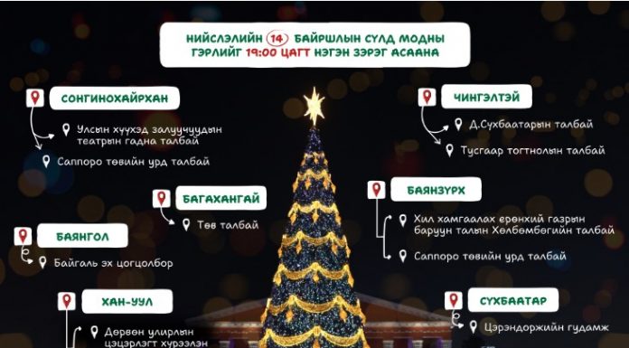 Нийслэлийн есөн дүүргийн 14 байршилд зассан сүлд модны гэрлийг өнөөдөр 19:00 цагт зэрэг асаана