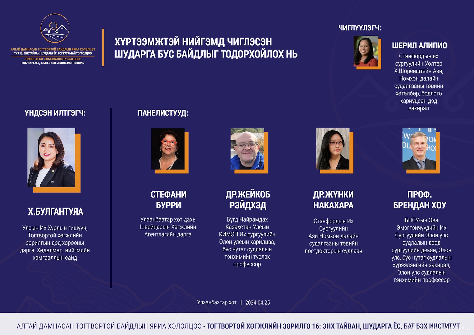 Монгол Улсын Их Хурал, Америкийн Нэгдсэн Улсын Стэнфордын Их сургууль, Бүгд Найрамдах Солонгос Улсын “Бан Ги Мүн” сан хамтран “Алтай дамнасан тогтвортой байдлын яриа хэлэлцээ – Тогтвортой хөгжлийн зорилго 16: Энх тайван, шударга ёс, тогтуурьтай тогтолцоо” олон улсын чуулга уулзалтыг 2024 оны 04 дүгээр сарын 25, 26-ны өдрүүдэд Улаанбаатар хотноо зохион байгуулах гэж байна.