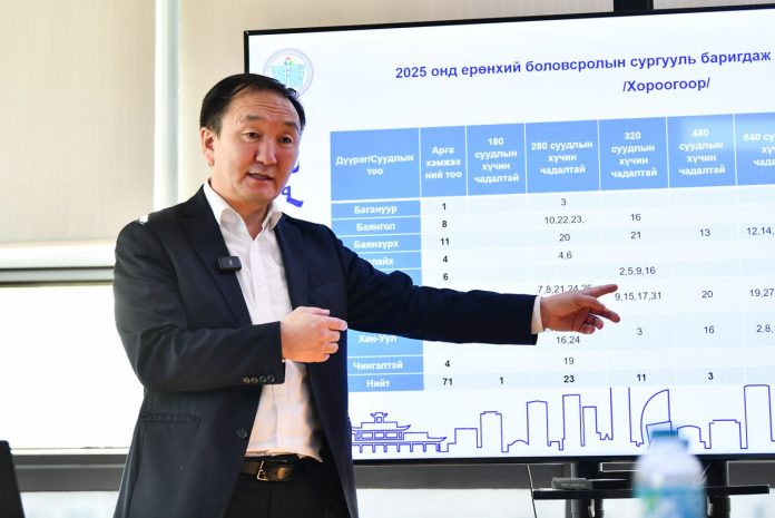 Боловсролын хүртээмж, сургалтын чанарыг хэрхэн сайжруулах, хэрэгжүүлж буй төсөл, арга хэмжээ, тулгамдсан асуудлаа танилцууллаа. Тухайлбал, Нийслэл Улаанбаатар хотод нийт ЕБС-д суралцагчийн 50 орчим хувь, СӨБ-ын хүүхдийн 48 хувь нь сурч, боловсролын байгууллагын 42 хувь нь төвлөрч байгааг хэллээ. Сүүлийн дөрвөн жилд 114 цэцэрлэгийн барилга, 45 сургуулийн барилга, найман бага сургуулийн барилга ашиглалтад орсон. Шинэ суурьшил, шинэ хотхон хороолол сүндэрлэх бүрд стандарт алдагдаж байна. Хан-Уул дүүргийн IV, XXIII хороонд орон сууцны хотхон ихээр барих суурьшил үүсээд байгаа хэрнээ сургууль, цэцэрлэг байхгүй. Тиймээс хүн амын тоотой уялдуулан сургууль, цэцэрлэгийн барилгыг төлөвлөж ашиглалтад хүлээж авах шаардлагатай”-г онцоллоо.
