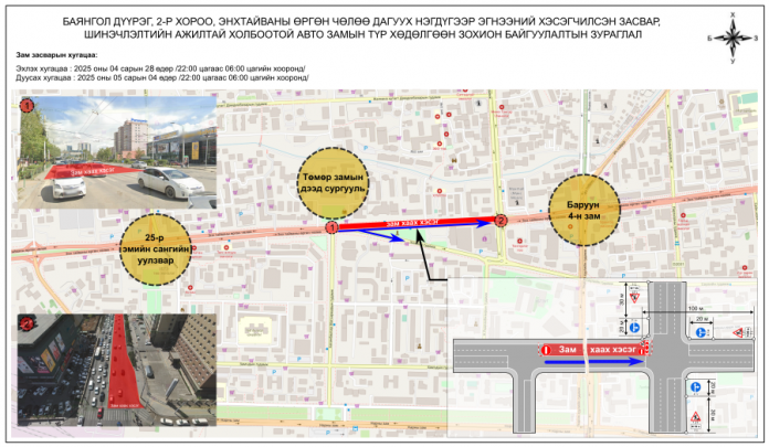 Нийслэлийн Баянгол дүүргийн Төмөр замын дээд сургуулиас Гранд плазагийн уулзвар хүртэлх авто замыг хааж засна.