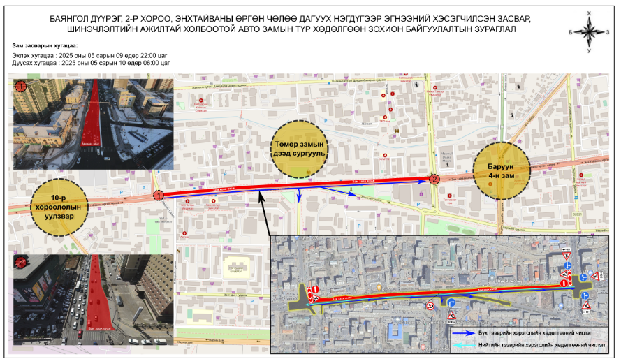 БГД-ийн 2 дугаар хороо, Энхтайваны өргөн чөлөөний авто зам шинэчлэлтийн ажлын хүрээнд 25 дугаар эмийн сангийн уулзвараас "Гранд плаза"-ийн уулзвар хүртэлх авто замын хойд хэсгийг 5 дугаар сарын 9-ний 22:00 цагаас 10-ны өдрийн 06:00 цагийн хооронд хааж, шинэчилнэ.
