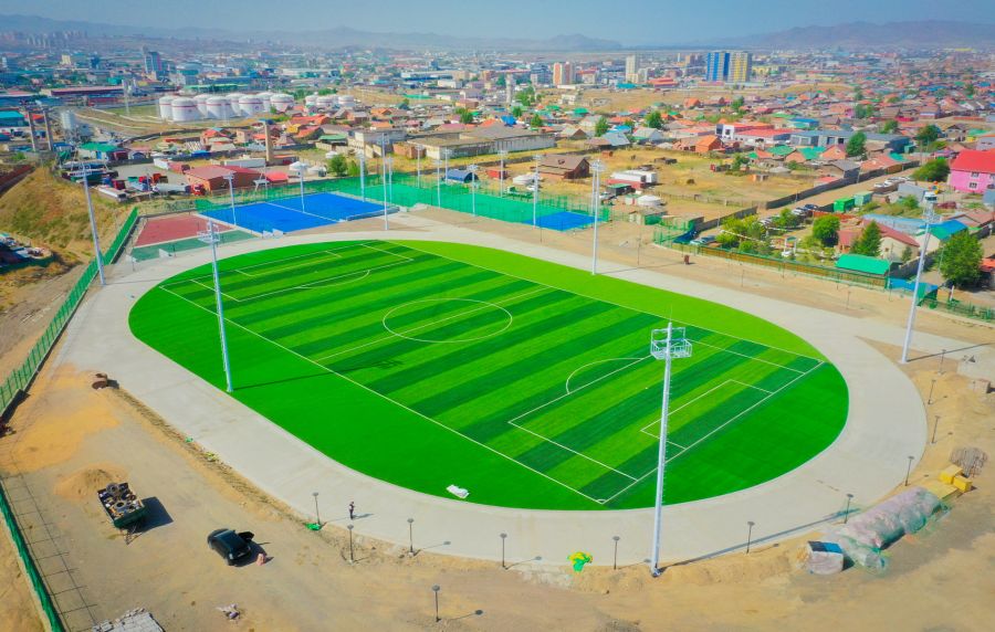 Тус цогцолборын зураг төслийг 2021 онд боловсруулж, 2022 онд газрыг чөлөөлсөн юм. Ингэхдээ 24 айлтай зөвшилцөж газрыг нь чөлөөлжээ. Улмаар барилгын ажлыг эхлүүлж, өнөөдөр 90 хувийн гүйцэтгэлтэй явааг албаныхан онцоллоо. Тус цогцолбор нь 95х45 хэмжээтэй хөлбөмбөгийн талбай 3х3 сагсан бөмбөгийн талбай, 5х5 сагсан бөмбөгийн хоёр талбай, талбайн теннисний хоёр талбай, зургаан эгнээ бүхий гүйлтийн замаас бүрдэж байгаа юм.
