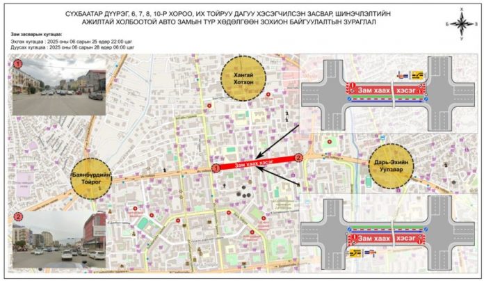 Нийслэлийн Сүхбаатар дүүргийн Их тойруугийн авто замыг хэсэгчлэн засах хүрээнд Өлзий төвөөс 100 айлын уулзвар хүртэлх авто замыг хааж шинэчилнэ.