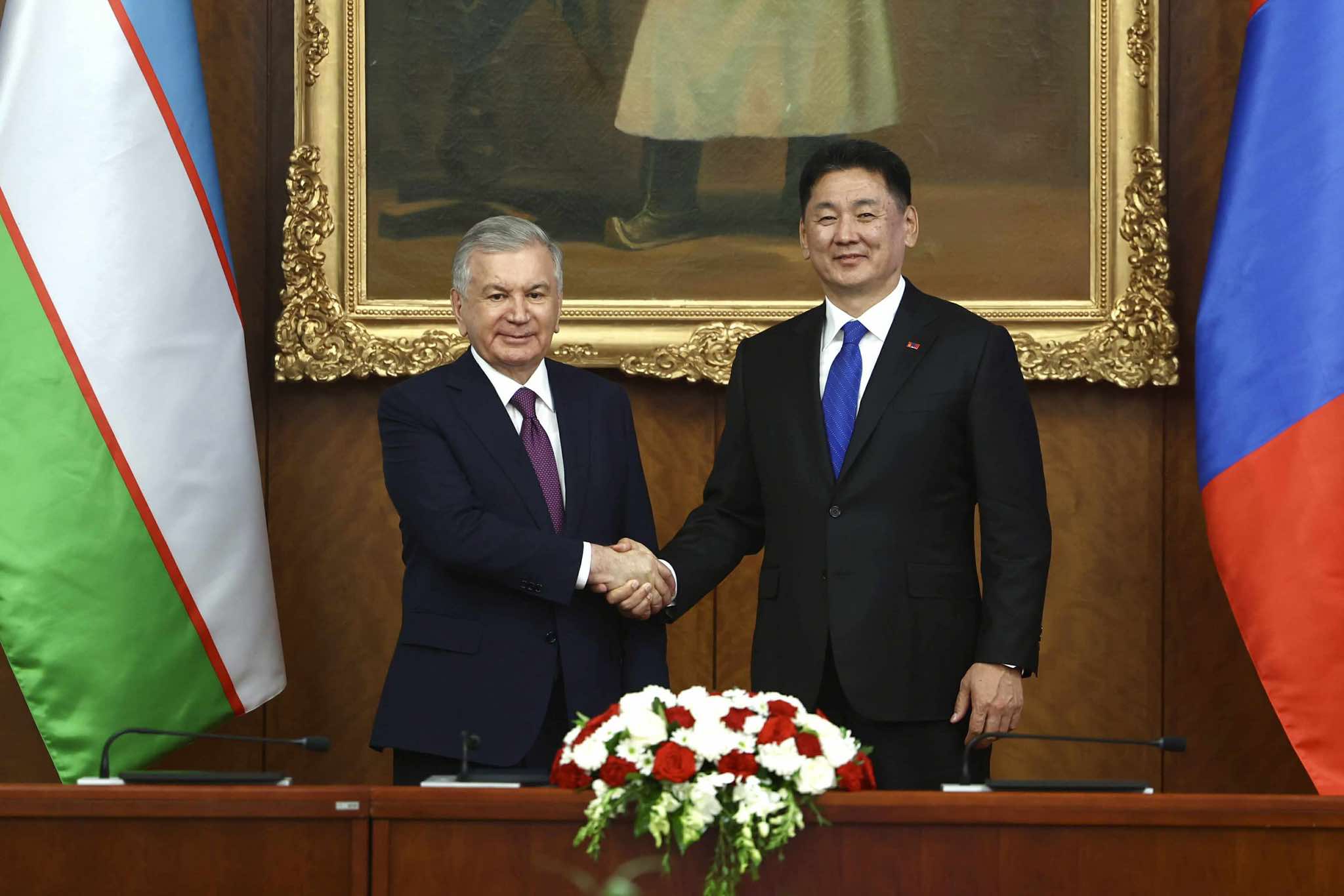 Ерөнхийлөгч Ш.Мирзиёев Монгол Улсад анх удаа төрийн айлчлал хийж буйдаа сэтгэл өндөр байгаагаа илэрхийлээд, Ерөнхийлөгч У.Хүрэлсүхийн 2024 онд Узбекистан Улсад хийсэн төрийн айлчлалаас хойш хоёр улсын хамтын ажиллагаа олон салбарт эрчимжиж буйг онцоллоо.