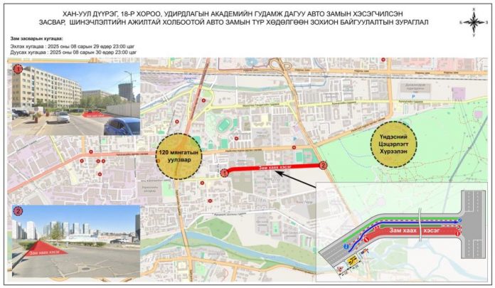 Нийслэлийн Удирдлагын академийн гудамжны засвар, шинэчлэлтийн хүрээнд Их Монгол Улсын гудамжнаас Оргил худалдааны төвийн уулзвар хүртэлх авто замыг хааж асфальт бетон хучилт, тэмдэглэгээ хийнэ.