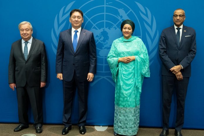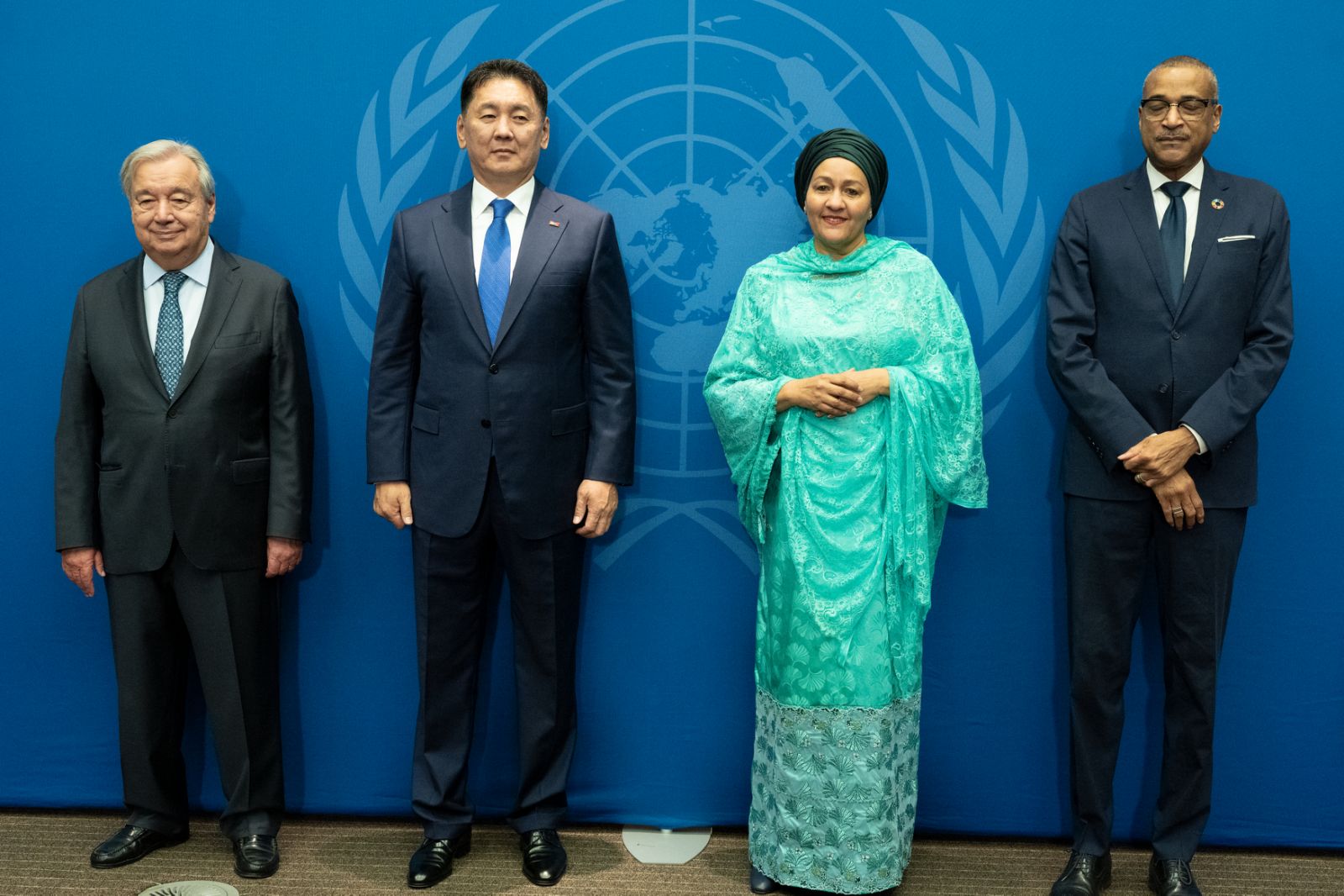Монгол Улсын Ерөнхийлөгчийг НҮБ-ын Төв байранд хүрэлцэн ирэхэд НҮБ-ын Ерөнхий нарийн бичгийн дарга Антонио Гутерреш албан ёсоор угтав.