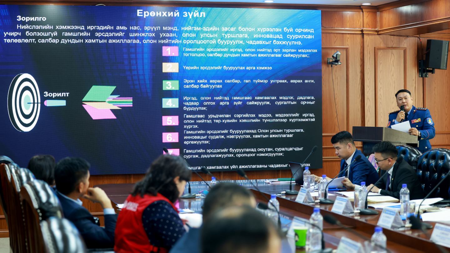 Түүнчлэн НОБГ-ын дарга, хурандаа Г.Галбадрах “Стратеги төлөвлөгөөний гол зорилго нь Нийслэлийн хэмжээнд иргэдийн амь нас, эрүүл мэнд, нийгэм-эдийн засаг болон хүрээлэн буй орчинд учирч болзошгүй гамшгийн эрсдэлийг шинжлэх ухаан, олон улсын туршлага, инновацад суурилсан төлөвлөлт, салбар дундын хамтын ажиллагаа, олон нийтийн оролцоотой бууруулж, чадавхыг бэхжүүлэхэд чиглэсэн. Энэхүү дунд хугацааны төлөвлөлтийг үешаттай хэрэгжүүлэхээр төлөвлөсөн бөгөөд эхний жилд суурь бэлтгэл хангаж, дараагийн 2-4 жилд тогтолцоог бэхжүүлж, 5 дахь жилд холбогдох үнэлгээ хийх болно” гэдгийг тайлбарлалаа. Хуралдаанд оролцсон зөвлөлийн гишүүдийн зүгээс Нийслэлийн гамшгийн эрсдэлийг бууруулах дунд хугацааны стратеги төлөвлөгөөг 2030 он хүртэл төлөвлөхдөө зөвхөн салбарын хүрээнд авч үзэлгүй, нийслэлийн хэмжээнд өргөн цар хүрээтэй асуудлыг хамруулах хэрэгтэй гэсэн саналыг хэллээ. Иймд дараагийн хуралдаанаар Зөвлөлийн гишүүдийн саналыг тусгаж, хэлэлцсэний дараа батлах нь зүйтэй гэж үзлээ.