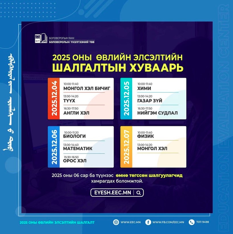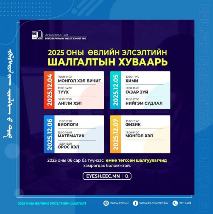 Харин арванхоёрдугаар сарын 5-нд хими, газарзүй, нийгмийн шалгалтыг авна. Мөн арванхоёрдугаар сарын 6-нд биологи, математик, орос хэл 7-нд физик, монгол хэлний хичээлийн шалгалтыг авахаар төлөвлөөд байна.